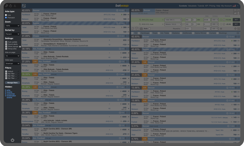 Multifilters with a huge number of settings, an Accounting tool for recording your bets, a Hide menu to remove +EV from the scanner, and many other features which will make your work comfortable.